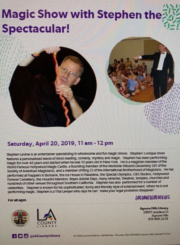 Stephen has been performing at parties and functions for over 30 years and is a member of the World Famous Magic Castle, the Society of American Magicians and the International Brotherhood of Magicians. He has performed at the Special Olympics, CBS Studios, Flappers Comedy Club in Burbank, California, the Ice House in Pasadena, California, the Hollywood Forever Cemetary, Wineries, Libraries, YMCAs and many more places and private and public events. For the little ones or those that want to learn, Stephen provides magic lessons. Everyone loves to learn the secrets of magic! Here is a gift specially designed for your children ages 5 & older. Stephen will perform a few tricks and then have your children learn how to do some on their own! Supplies and personalized instruction are provided. Unique and lots of fun!!